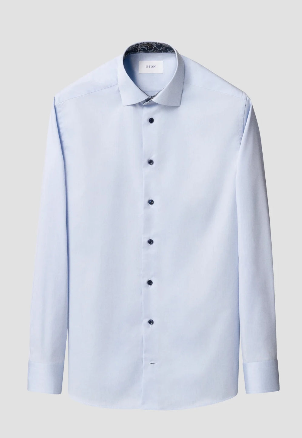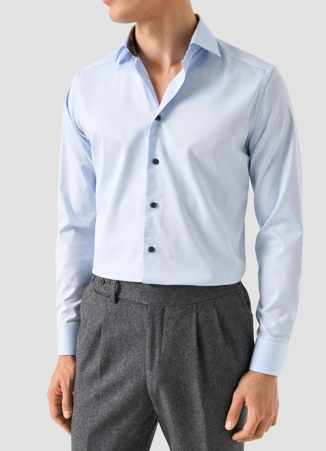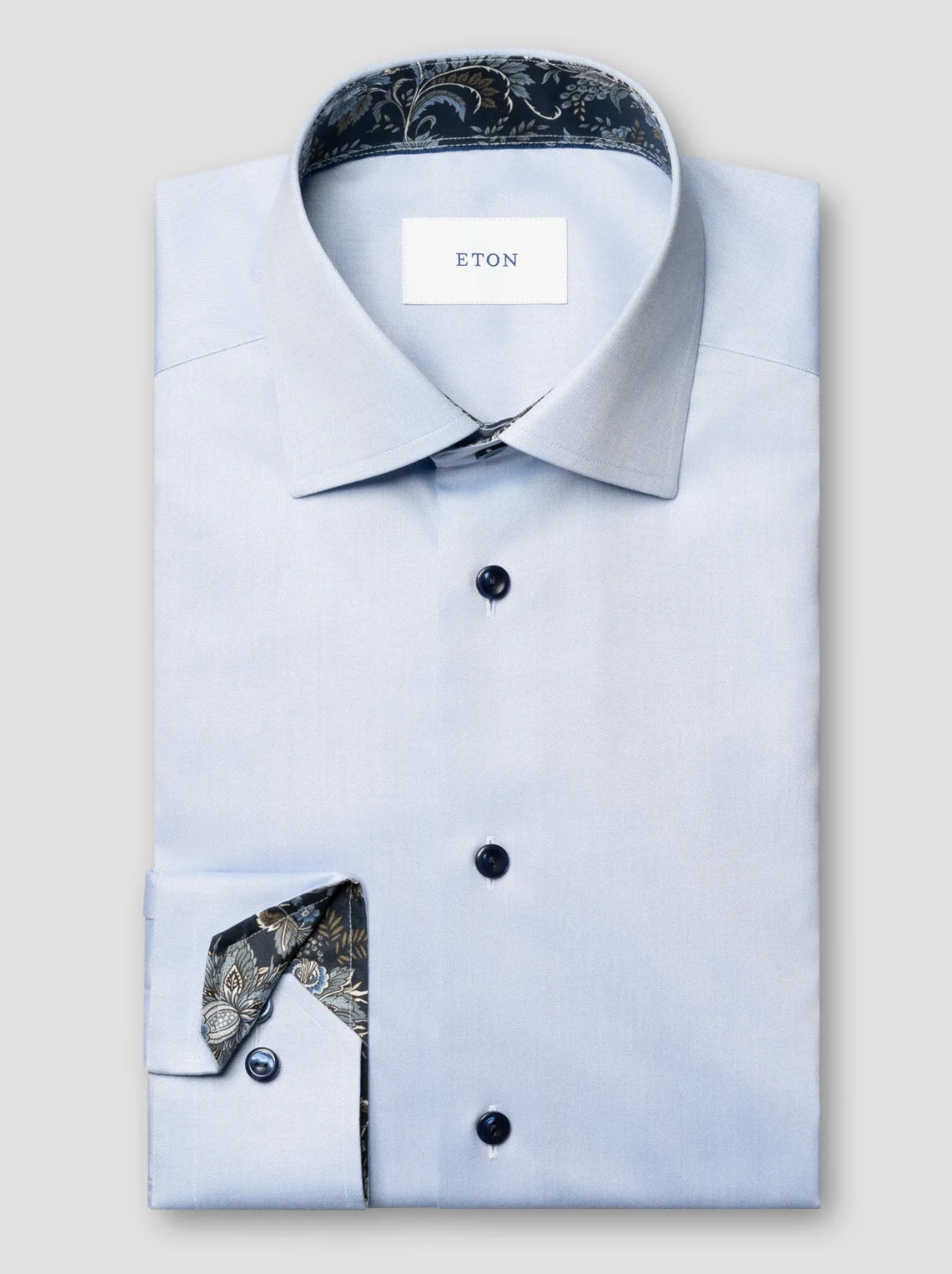 Elevate your wardrobe with this Eton Signature Twill dress shirt, expertly tailored from 100% cotton for a crisp, structured feel and exceptional comfort. The soft, wrinkle-resistant Signature Twill fabric offers a polished look that lasts all day. Designed with refined contrast floral fabric inside the collar and cuffs, and tonal buttons that subtly complement the print—perfect for adding personality to your formal or business-casual style.
