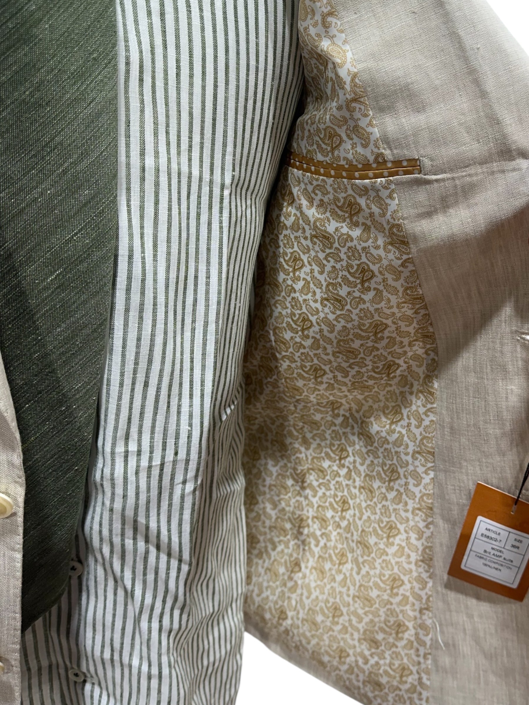 Designed with low-structured shoulders for a more natural silhouette, this piece delivers a perfect blend of tailored polish and casual ease. The versatile tan color pairs effortlessly with a range of styles—and for a coordinated look, matching linen pants are available for purchase to complete the set.